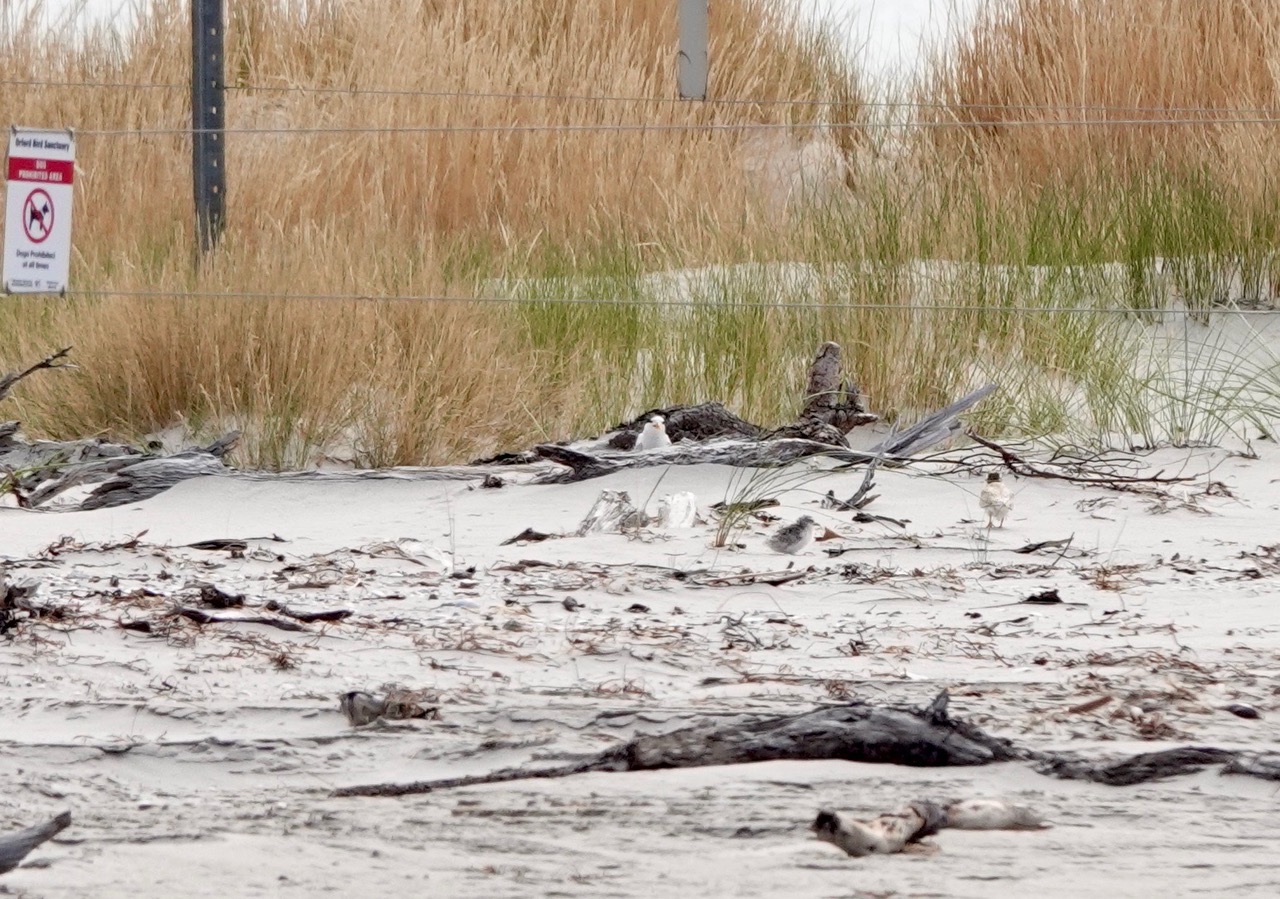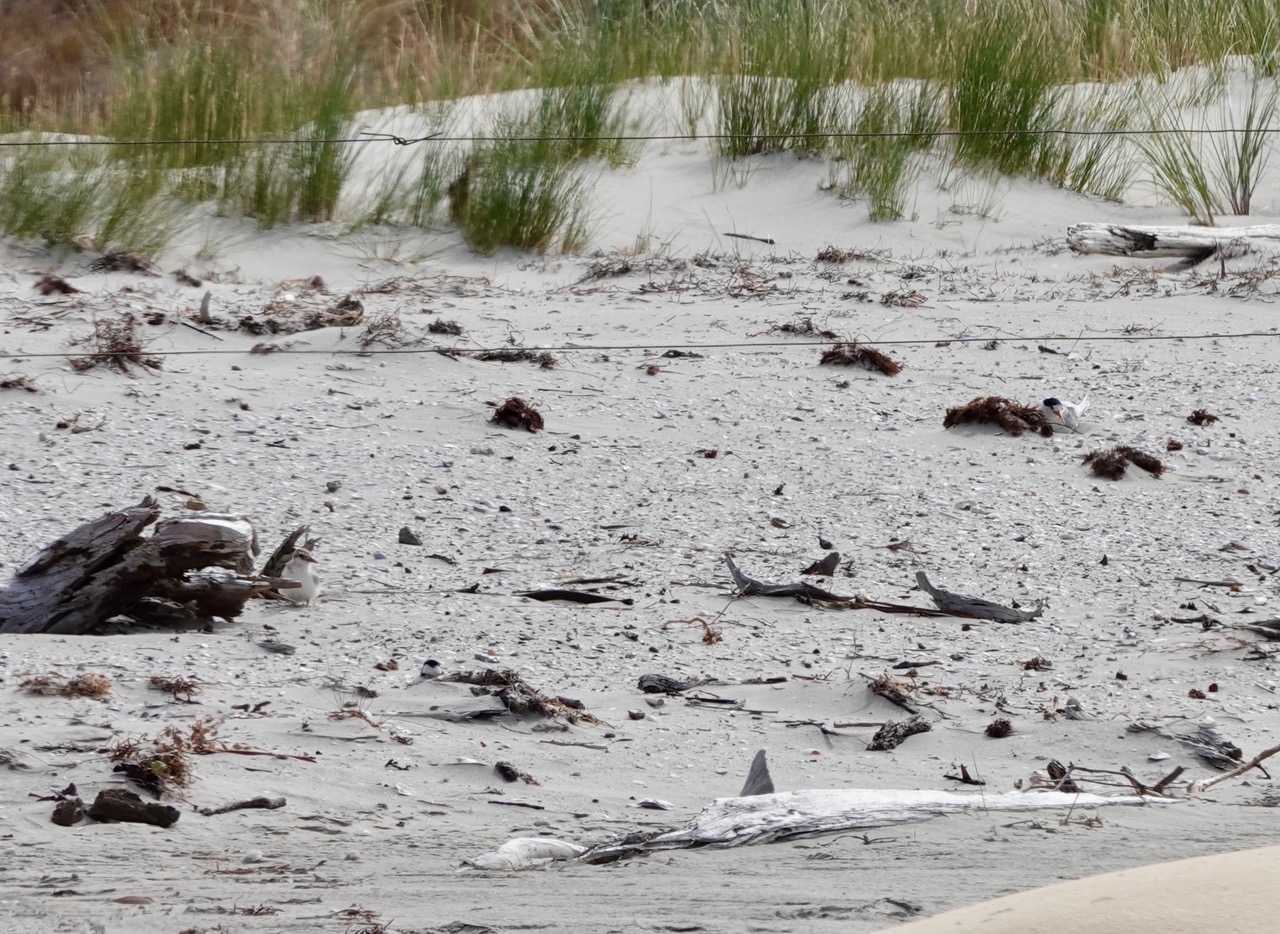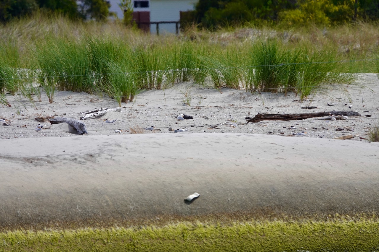 Good news, I counted at least 32 adult terns sitting on the sand, most nestled down into the sand, likely in a nest scrape, with other Terns flying in and out. I say at least 32, because there was a section of the colony behind sandbags and sedges that I couldn’t see, but there were terns flying in and out from this area, so clearly additional birds.
