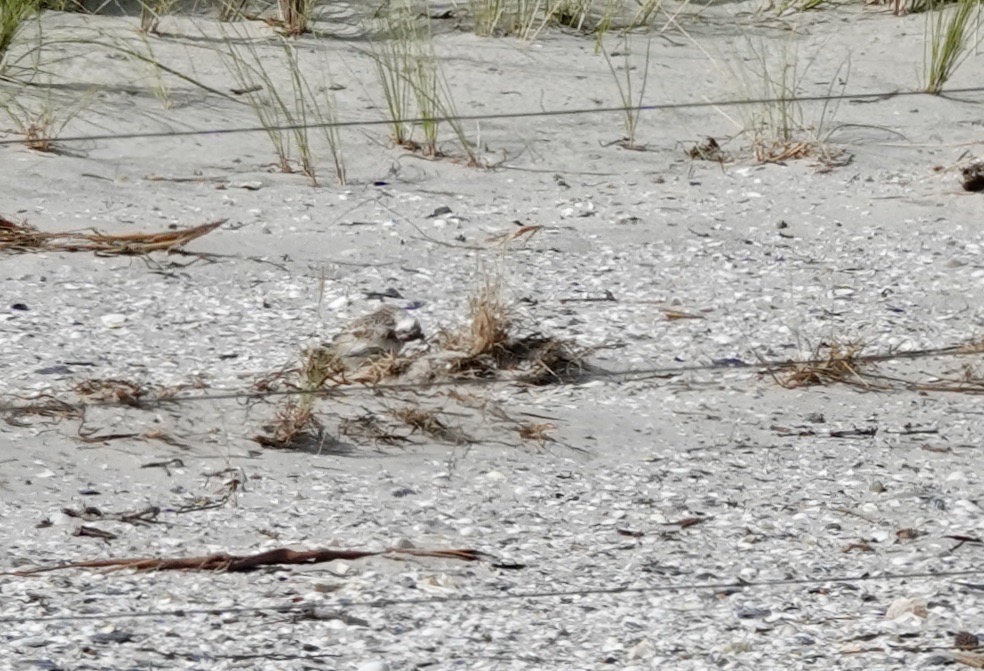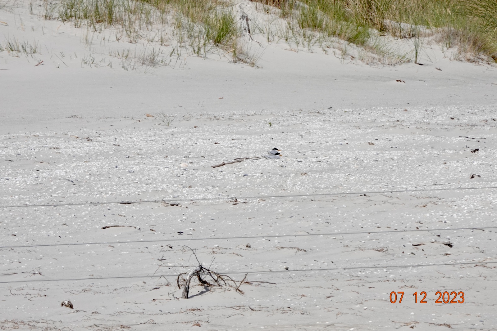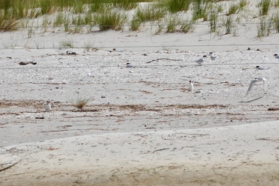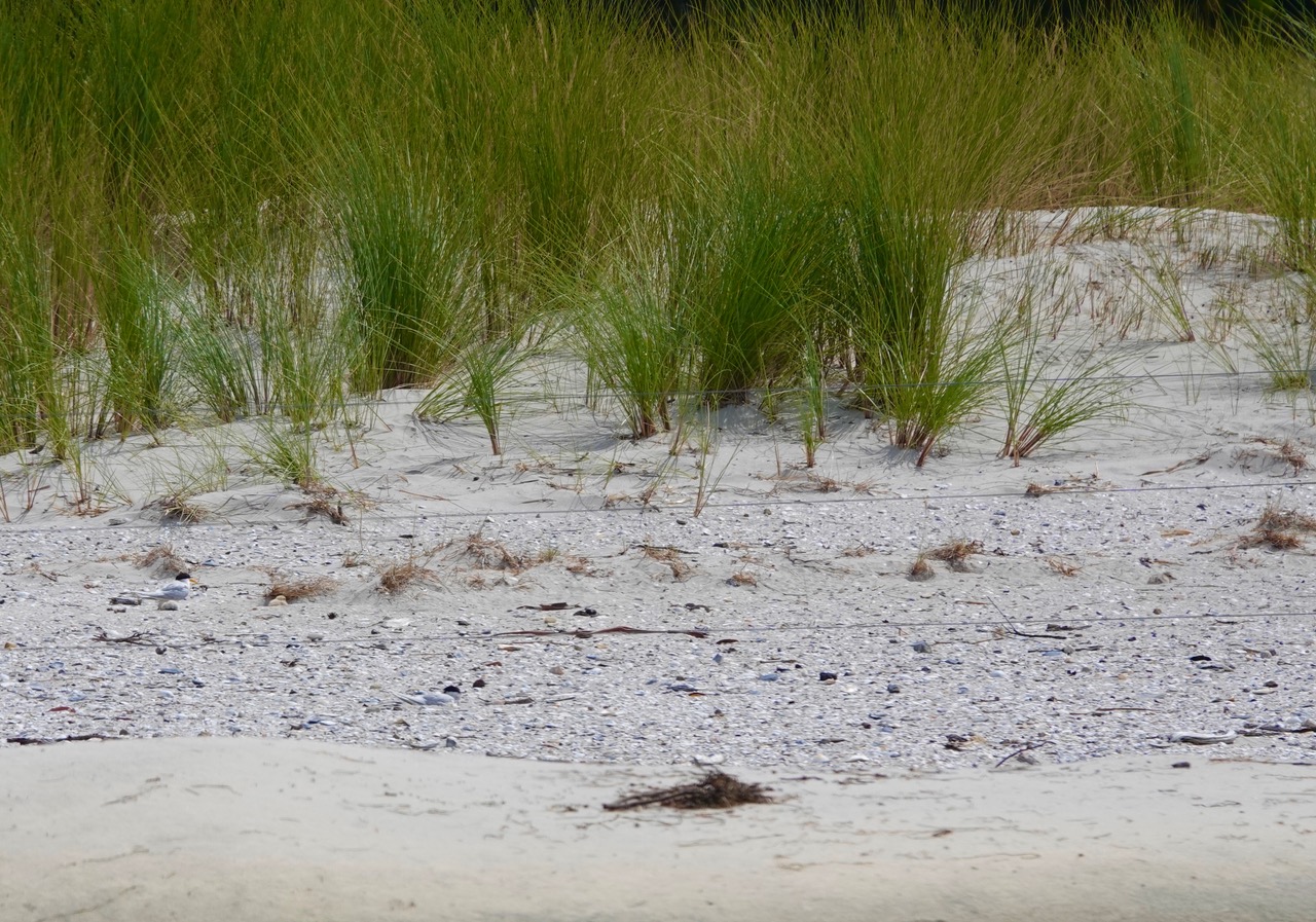 Good news, I counted at least 32 adult terns sitting on the sand, most nestled down into the sand, likely in a nest scrape, with other Terns flying in and out. I say at least 32, because there was a section of the colony behind sandbags and sedges that I couldn’t see, but there were terns flying in and out from this area, so clearly additional birds.