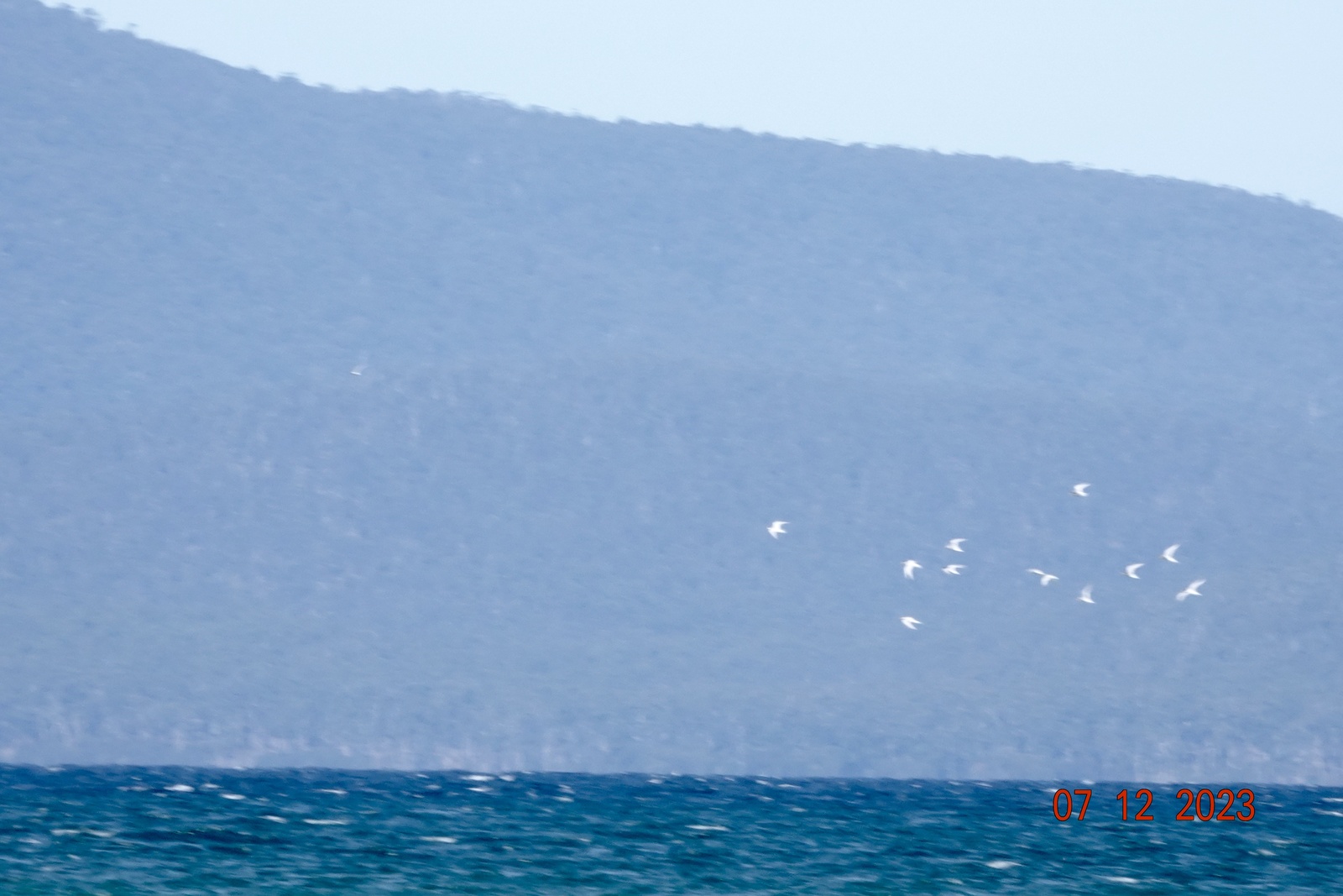 Image 1. The colony in flight. Note the flock is somewhat strung out and flying towards the camera - hence the apparent variation in size of the birds. I estimate about adult 44 Fairy Terns.