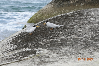 I observed protective behaviours that suggest nesting; Terns chasing a couple of silver gulls away from the colony, and even warning off a pied oystercatcher that was getting too close to a nest. I also observed territorial behaviour towards other Fairy Terns attempting to land too close to a nesting tern.