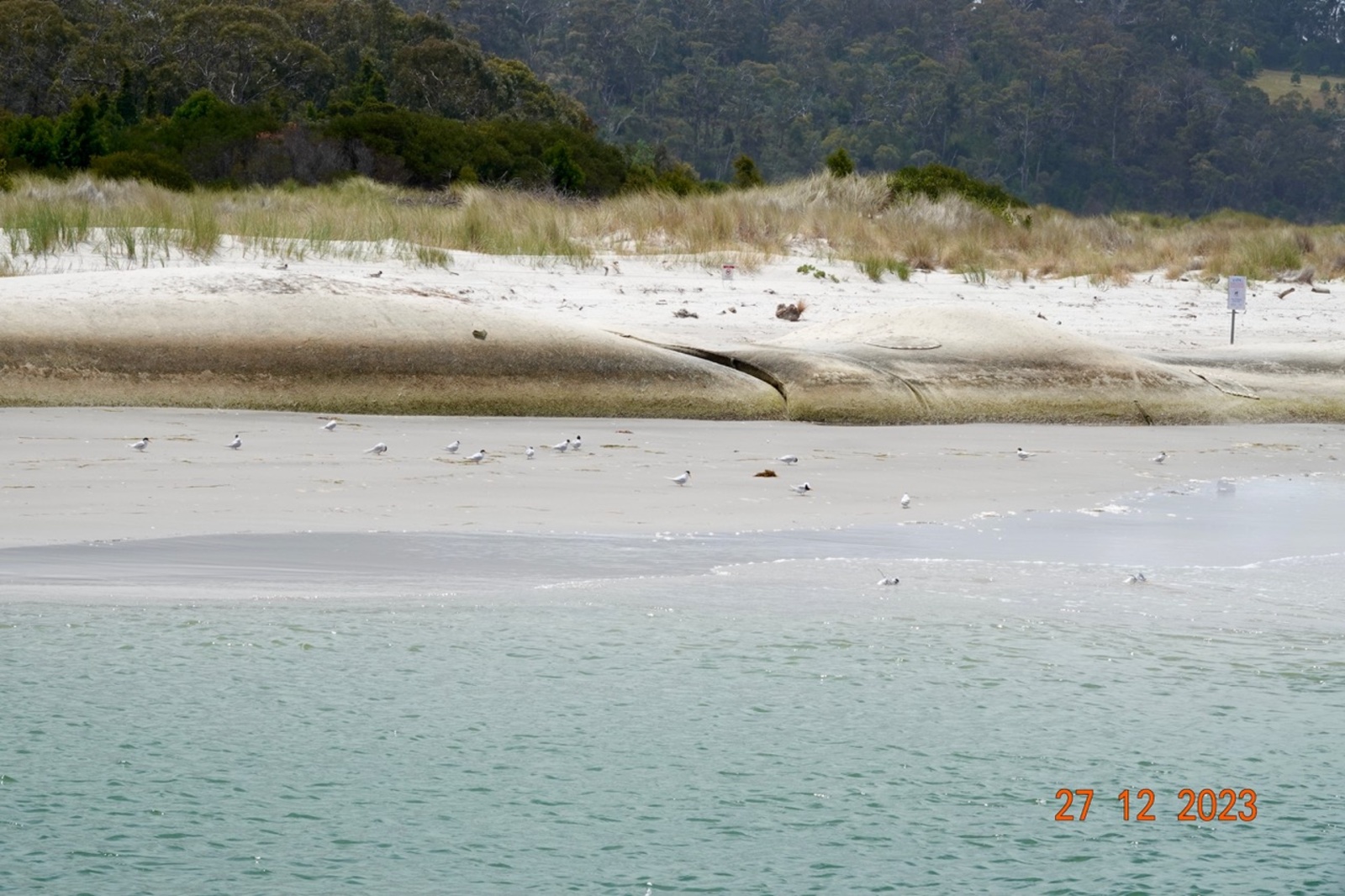 On two occasions, boats with fishers on board entered the channel - all roosting Fairy Terns and Crested Terns immediately flew off the bags - any claims that the terns 'tolerate' these events are baseless and easily refuted.
