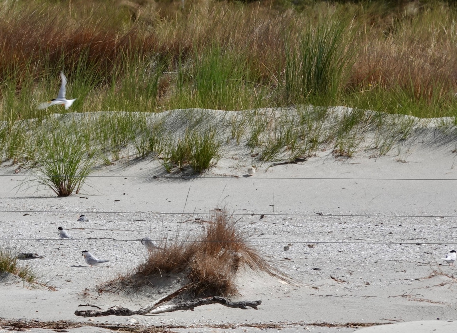 I visited the colony yesterday afternoon to survey the breeding Fairy Terns. I am delighted to report that 34 chicks and fledged juveniles were observed. This total comprised approximately 20 chicks that were too young to fly, and at least 14 flying juveniles that had successfully fledged but were still in attendance at the colony. The colony was very busy and very noisy, with foraging adults feeding chicks predominantly inside the eastern extent of the fenced area and on the adjacent foreshore. Foraging trips by the adults were from both the backwater and from the bay east of the colony.