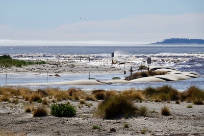 "Waves washing up to the base of the foredune / fence along Raspins Beach, The conditions attracted approximately 20 surfers."