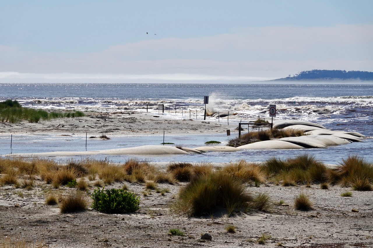 Collaboration between Marine and Safety Tasmania (MAST), Friends of Orford Bird Sanctuary and the Parks and Wildlife Service (PWS) has resulted in excess sand build-up dredged from the Prosser River mouth being distributed onto the end of the Raspins Beach sandspit (which forms part of the bird sanctuary) to help prevent this potential breeding area from being washed out by storm surges. This area is where the Fairy Terns had one of their most successful bredding seasons in 2020. Since that time the sand had progressively resettled resulting in a significant reduction in suitable breeding habitat.