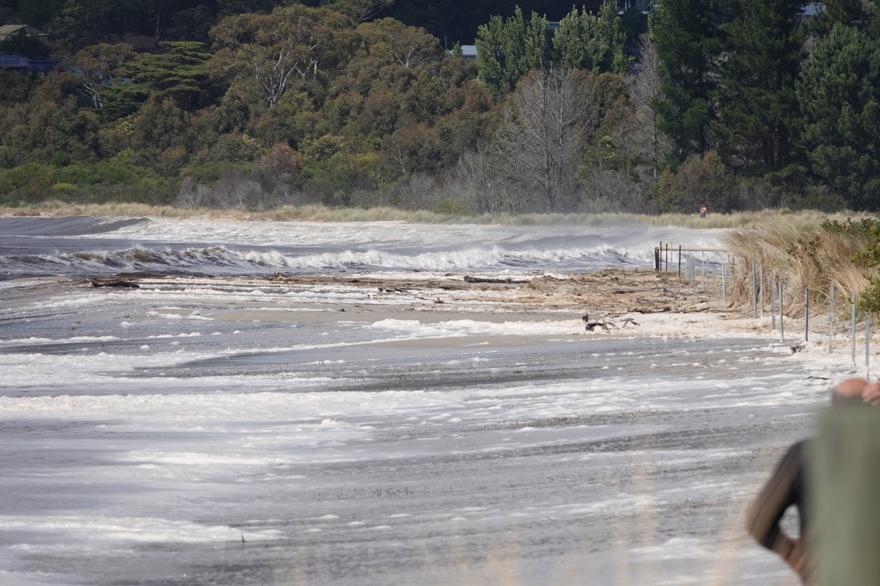 "Strong river flow, meets easterly swell at high tide - flooding some areas at the end of the sand spit."