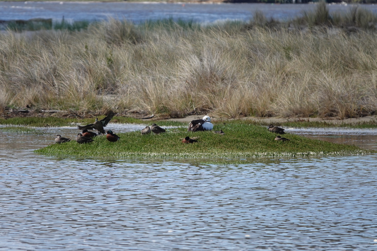 "A Pelican and Chestunt Teals resting on a slightly elevated area of samphire in the lagoon. Samphire is becoming more extensive along the upper (fringing) intertidal shoreline of the lagoon."