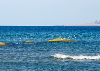 "Contrasting sheltered conditions at high tide in the lagoon."